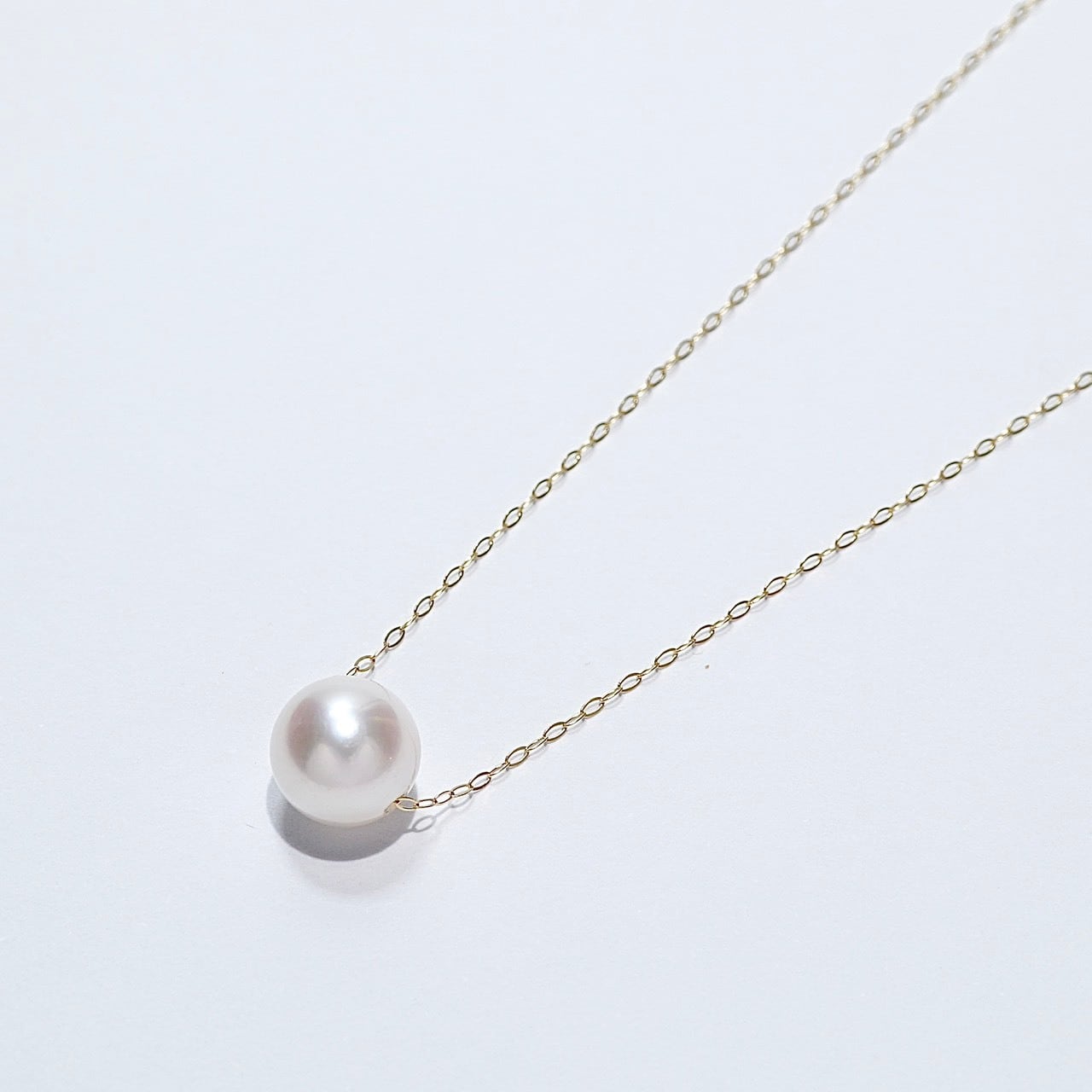 スルーペンダントはパールがチェーンの上を自由に動く仕様で、自然な位置で輝きを楽しめるデザイン。K18イエローゴールドが肌に優しくなじみ、花珠真珠の上質な艶と透明感をより一層際立たせます。