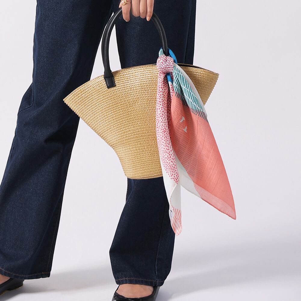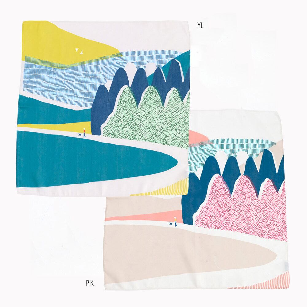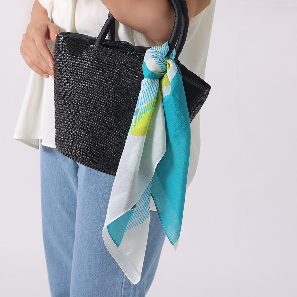 瀬戸内海に浮かぶ直島を散歩している風景をテーマにしたデザインのスカーフで、広げると風景画ですが、巻くと幾何学模様のような柄に見えるのがポイントです。